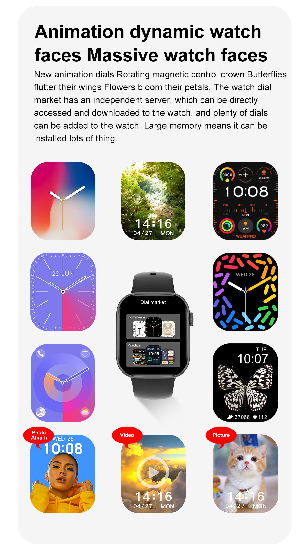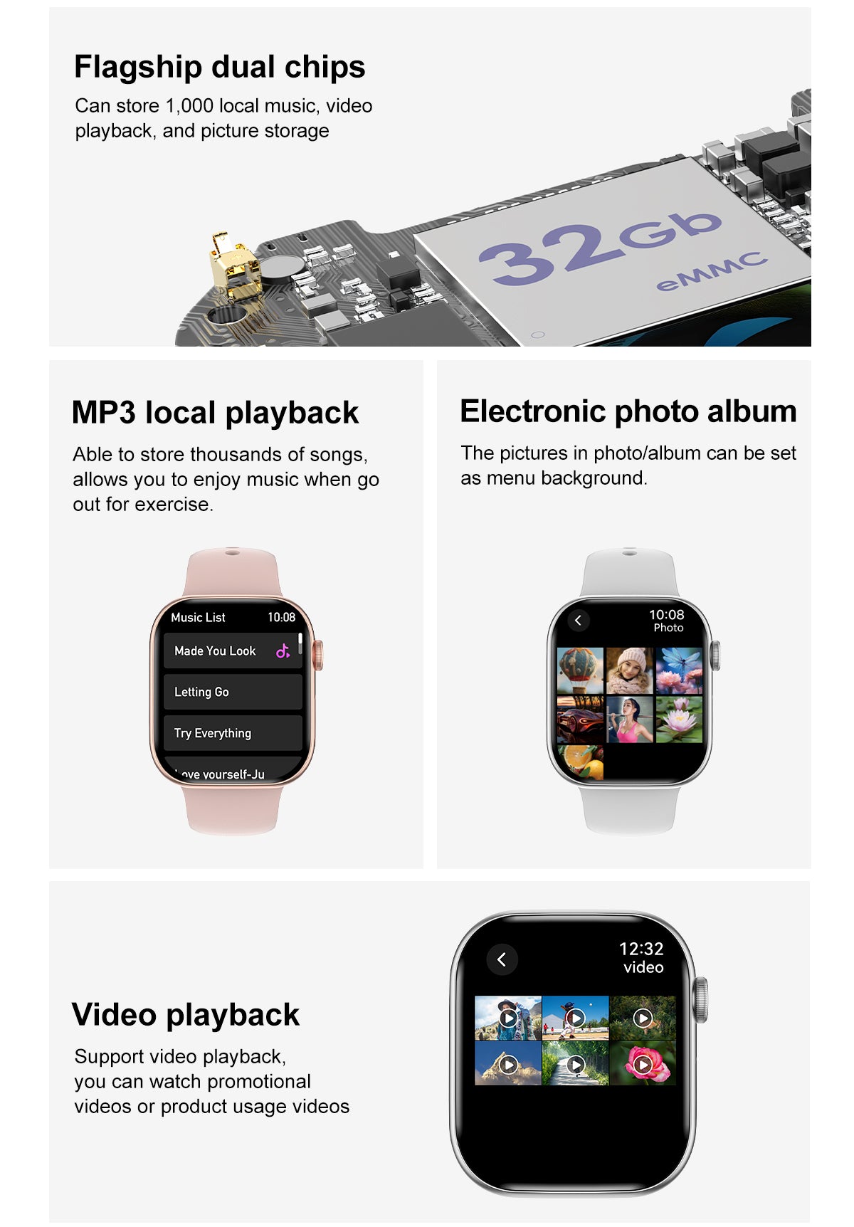 Chiamate Bluetooth, 9 stili di menu, modalità multi-sport, frequenza cardiaca, ossigeno nel sangue, sonno, meteo, riproduzione musicale Bluetooth, riproduzione musicale locale, allenamento della respirazione, assistente vocale, registri degli esercizi, contatti, registri delle chiamate, push delle informazioni, calcolatrice, registratore, giochi, sveglia, cronometro, timer, torcia elettrica, trova telefono cellulare, scatto di foto da remoto (collegamento al telefono cellulare), album, video, componenti rapidi, regolazione della luminosità, modalità di risparmio energetico, più quadranti di standby, impostazioni dello sfondo del menu, protezione tramite password